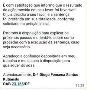 Criminosos estão enviando mensagens falsas via WhatsApp, utilizando o nome dos advogados mencionados acima, de forma fraudulenta, com o objetivo de obter vantagens ilícitas. Anexamos uma cópia de um exemplo dessas mensagens para sua referência.