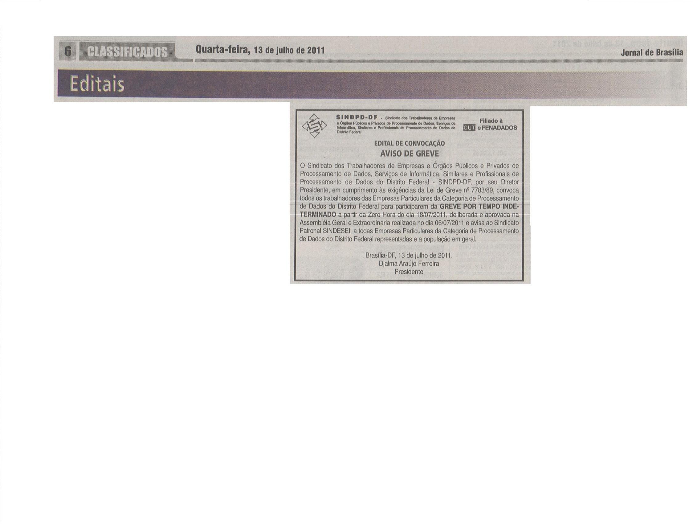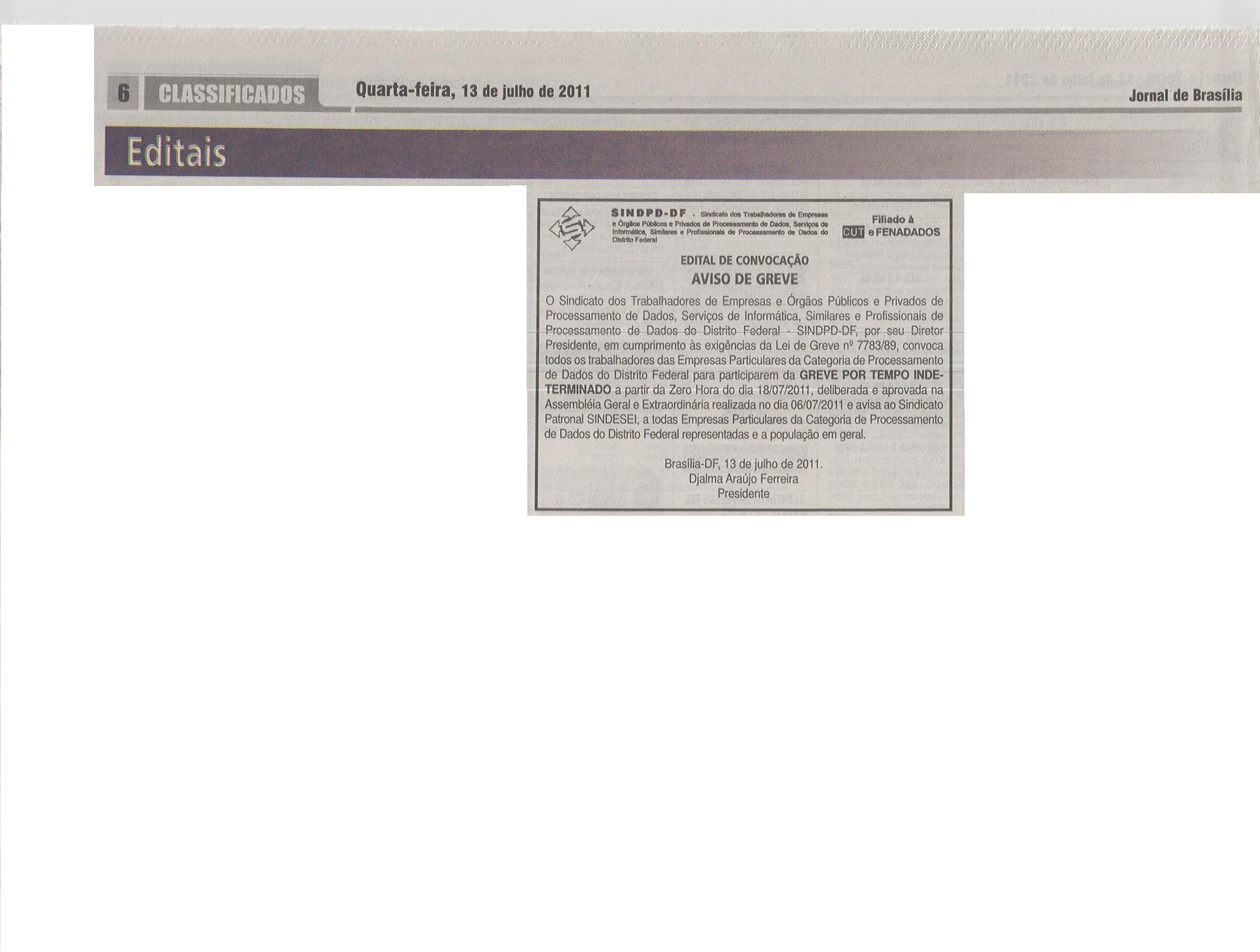 Notícias 13/07/2011 - SINDPD-DF publica o edital de aviso de greve dos trabalhadores das particulares 14/08/2025