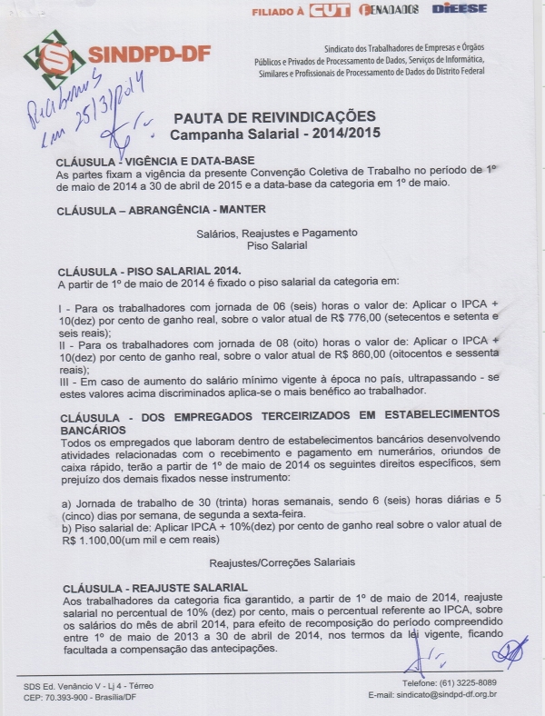 Trabalhador, chegou a hora da luta. O SINDPD-DF protocolou nesta terça-feira, 25/3, no sindicato patronal - SINDSEI-DF, a pauta de reivindicação dos trabalhadores das empresas particulares de TI do Distrito Federal. A pauta foi aprovada pelos trabalhadores da categoria no dia 19/3.