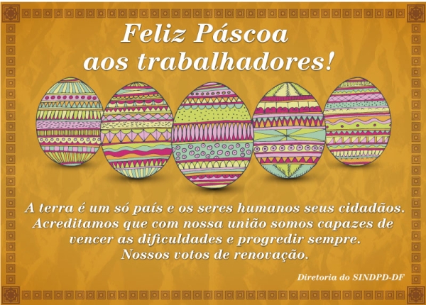 Notícias 17/04/2014 - FELIZ PÁSCOA AOS TRABALHADORES 14/08/2025 A terra é um só país e os seres humanos seus cidadãos. Acreditamos que com nossa união somos capazes de vencer as dificuldades e progredir sempre. Nossos votos de renovação. Diretoria do SINDPD-DF
