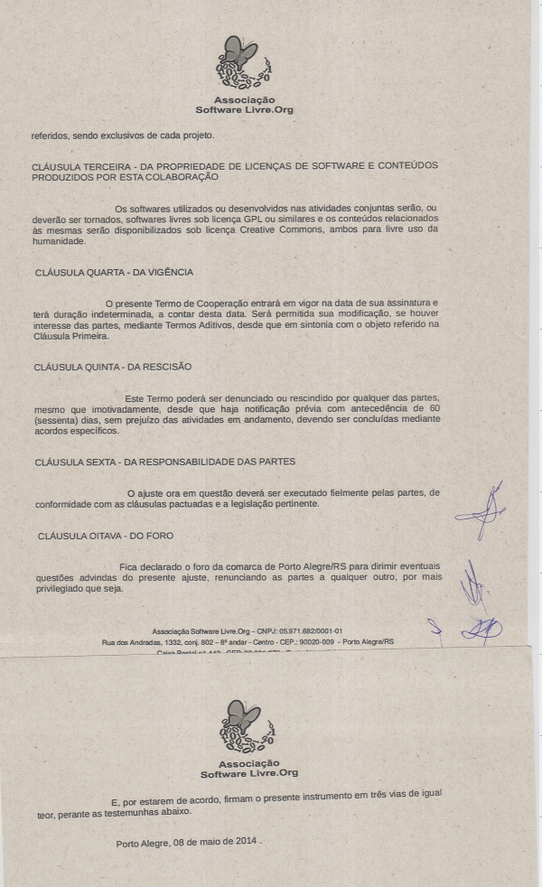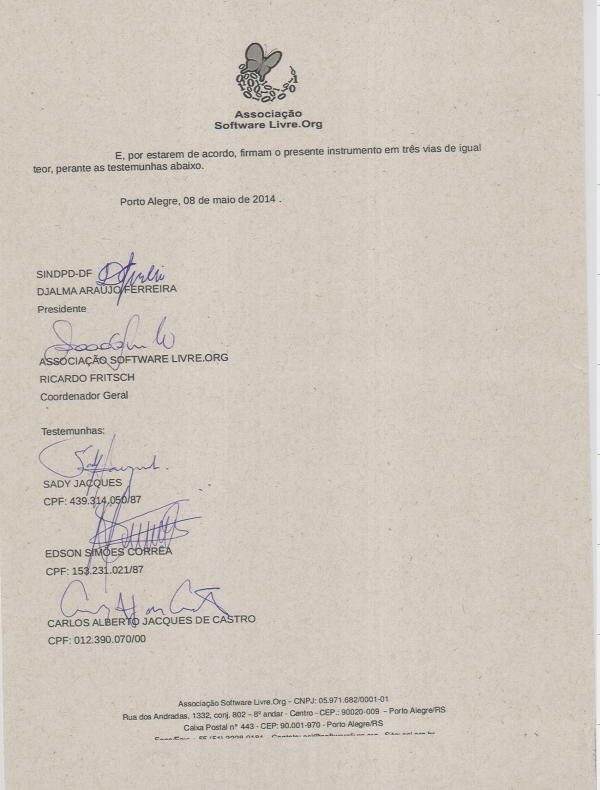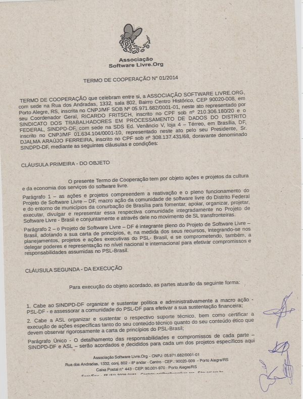 O termo assinado pelo presidente do SINDPD-DF, Djalma Ferreira, e o coordenador-geral da Associação de Software Livre.ORG, Ricardo Fritsch, tem um objetivo ambicioso e desafiador que é a reativação e o pleno funcionamento do Projeto de Software Livre no Distrito Federal e municípios do entorno para fomentar, apoiar, organizar, projetar, executar, divulgar e representar a comunidade da capital no Projeto de Software Livre - Brasil e, conjuntamente, e através dele, no movimento de SL transfronteiras.