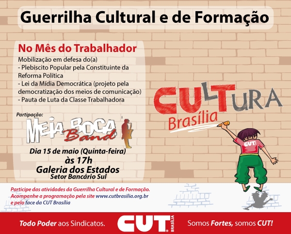Este será o lançamento da Guerrilha Cultural e de Formação da CUT Brasília, em comemoração ao mês do Trabalhador, uma programação de apresentações que se estende até o dia 30. Em cada dia, um artista popular se apresentará sob patrocínio dos sindicatos filiados à CUT numa área de grande concentração do Plano Piloto e das cidades satélites ou do Entorno.