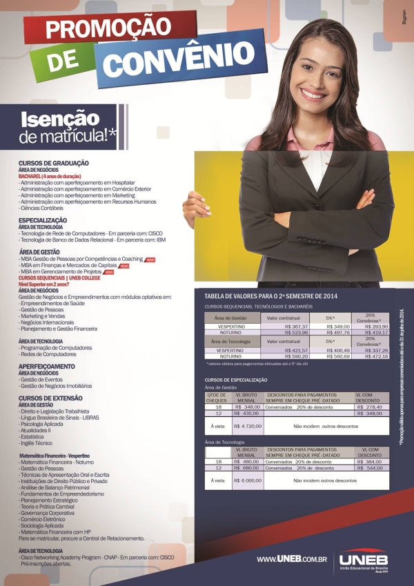 Notícias 24/07/2014 - PROMOÇÃO UNEB: ISENÇÃO DE MATRÍCULA 14/08/2025 Promoçã válida até o dia 31 de julho de 2014. Saiba mais no telefone: 2101-9900