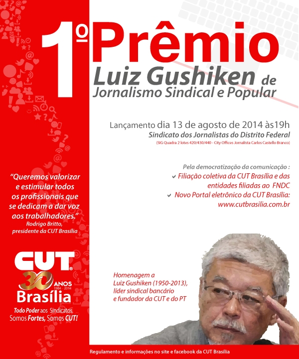 Como parte das comemorações dos 30 anos de fundação e para enfatizar o protagonismo da CUT Brasília, a Central está promovendo o Prêmio Luiz Gushiken de Jornalismo Sindical e Popular. A cerimônia de lançamento será no dia 13 de agosto, às 19h, no auditório do Sindicato dos Jornalistas Profissionais do DF, no Setor de Indústrias Gráficas (SIG).