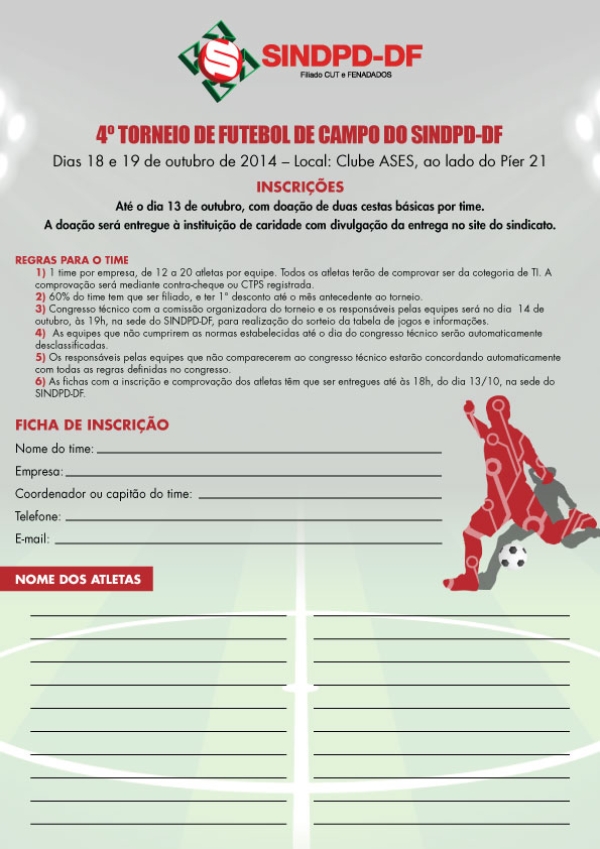 Notícias 21/09/2014 - 4º TORNEIO DE FUTEBOL DE CAMPO DO SINDPD-DF 14/08/2025 A ficha de inscrição abaixo deve ser entregue pessoalmente no SINDPD-DF.