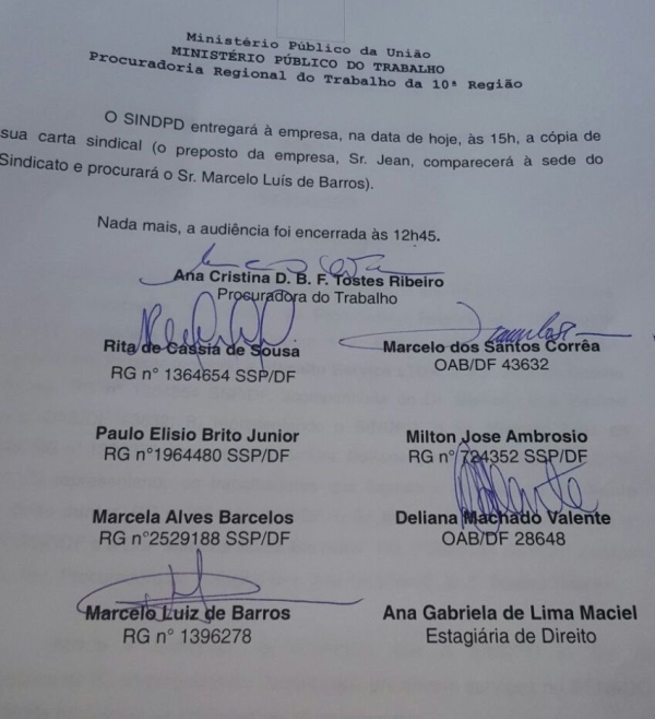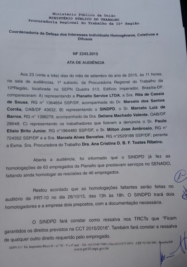 A decisão foi em audiência na PRT no dia 23/9, onde compareceram o dirigente do SINDPD-DF e a representante da empresa. Na ocasião, o sindicato informou que já havia realizado 63 homologações dos trabalhadores do contrato do Senado Federal.