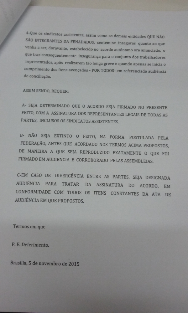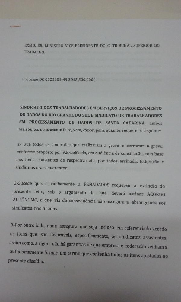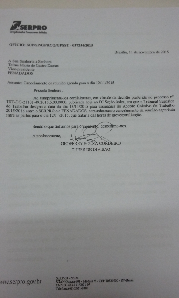 Em uma atitude unilateral, os sindicatos do RS e de SC protocolaram documento junto ao Superior Tribunal do Trabalho (TST) solicitando a assinatura do Acordo Coletivo de Trabalho no tribunal. O TST publicou no Diário de Justiça do dia 11/11/2015 a convocação de Serpro e Fenadados para assinatura de acordo no dia 13/11/2015. Mediante o comunicado, a empresa enviou ofício à federação cancelando a reunião que seria realizada hoje (12/11) para discussão dos dias parados.