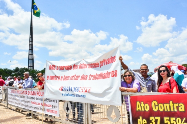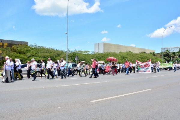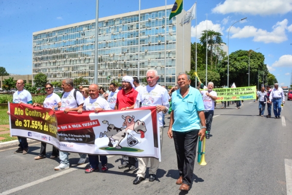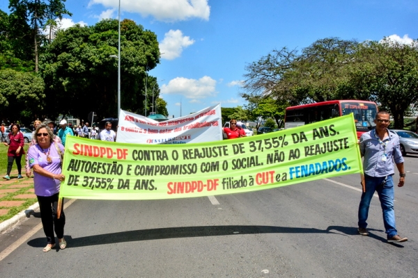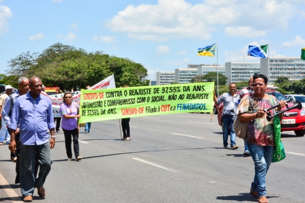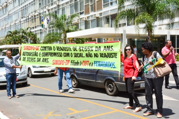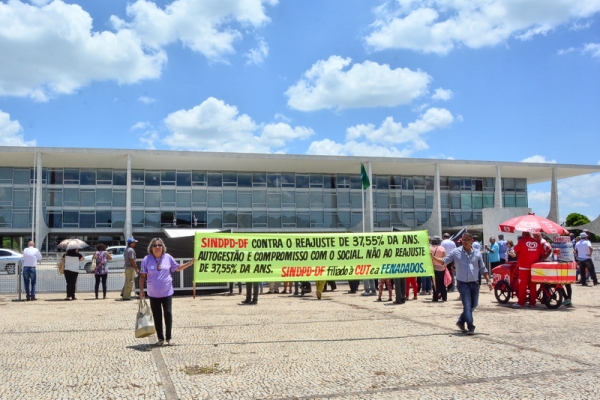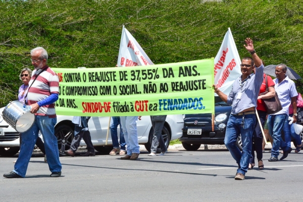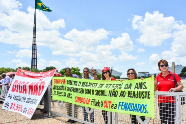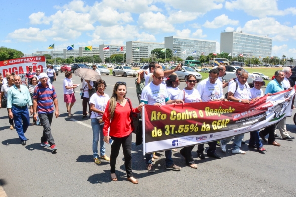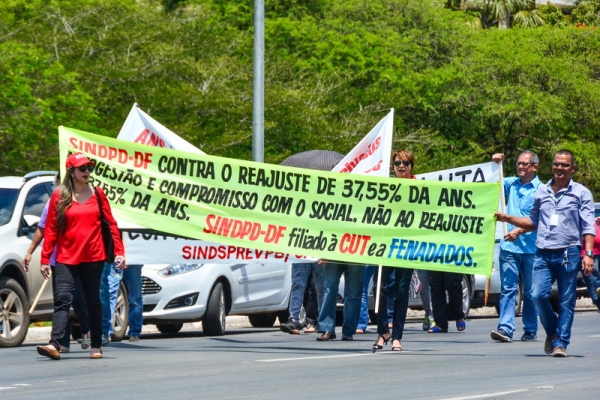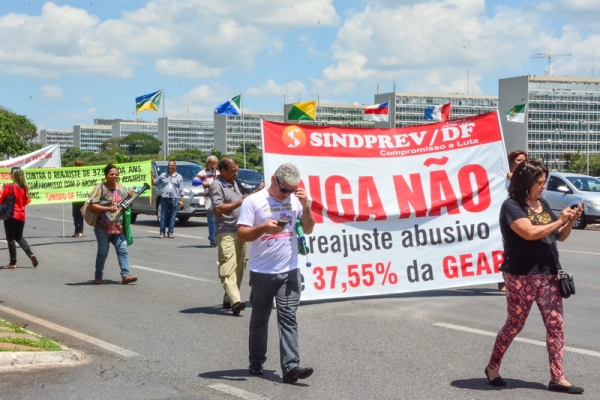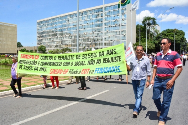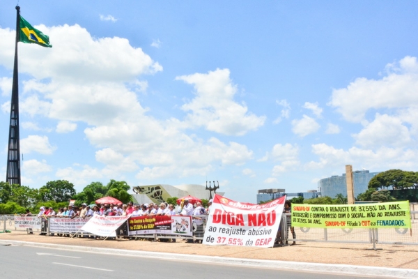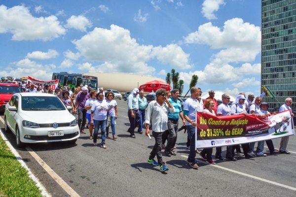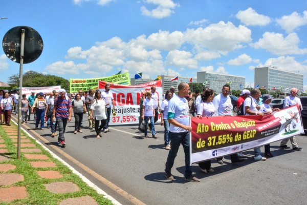 Os trabalhadores atendidos pela GEAP sairam em passeata do Ministério da Saúde até o Palácio do Planalto, nesta quarta-feira ( 17/2), para protestar contra o reajuste de 37,55% imposto ao plano de saúde pela Agência Nacional de Saúde Suplementar (ANS), o que agrava a situação financeira, uma vez que muitos assistidos não terão condições de arcar com este aumento.