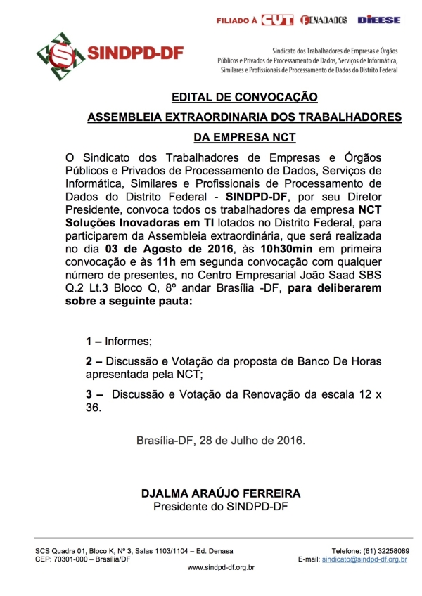 Dia 03 de Agosto de 2016, às 10h30min em primeira convocação e às 11h em segunda convocação com qualquer número de presentes, no Centro Empresarial João Saad SBS Q.2 Lt.3 Bloco Q, 8º andar Brasília -DF, para deliberarem sobre a seguinte pauta: