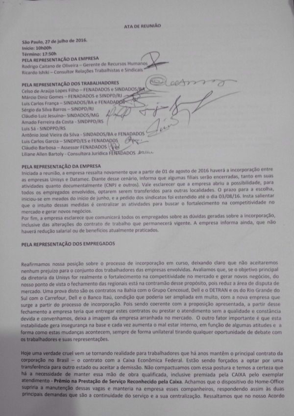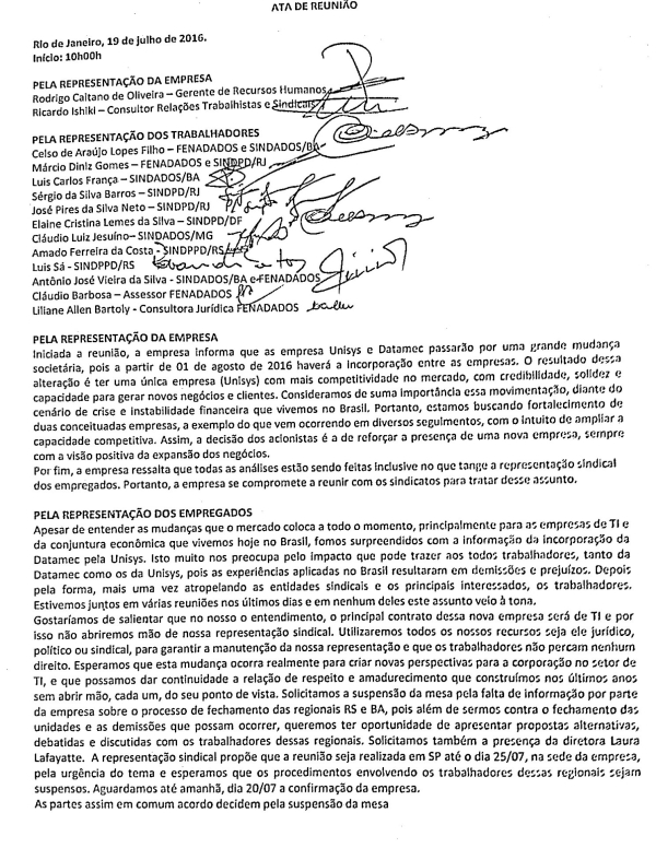 Os sindicatos e a federação que representam os trabalhadores de TI se reuniram nesta quarta, 27/7, com a empresa, onde foram informados da grande mudança societária a partir do dia 1/8, fruto da incorporação entre Datamec e Unisys. A direção acredita que com essa incorporação haverá mais geração de negócios e novos clientes.
