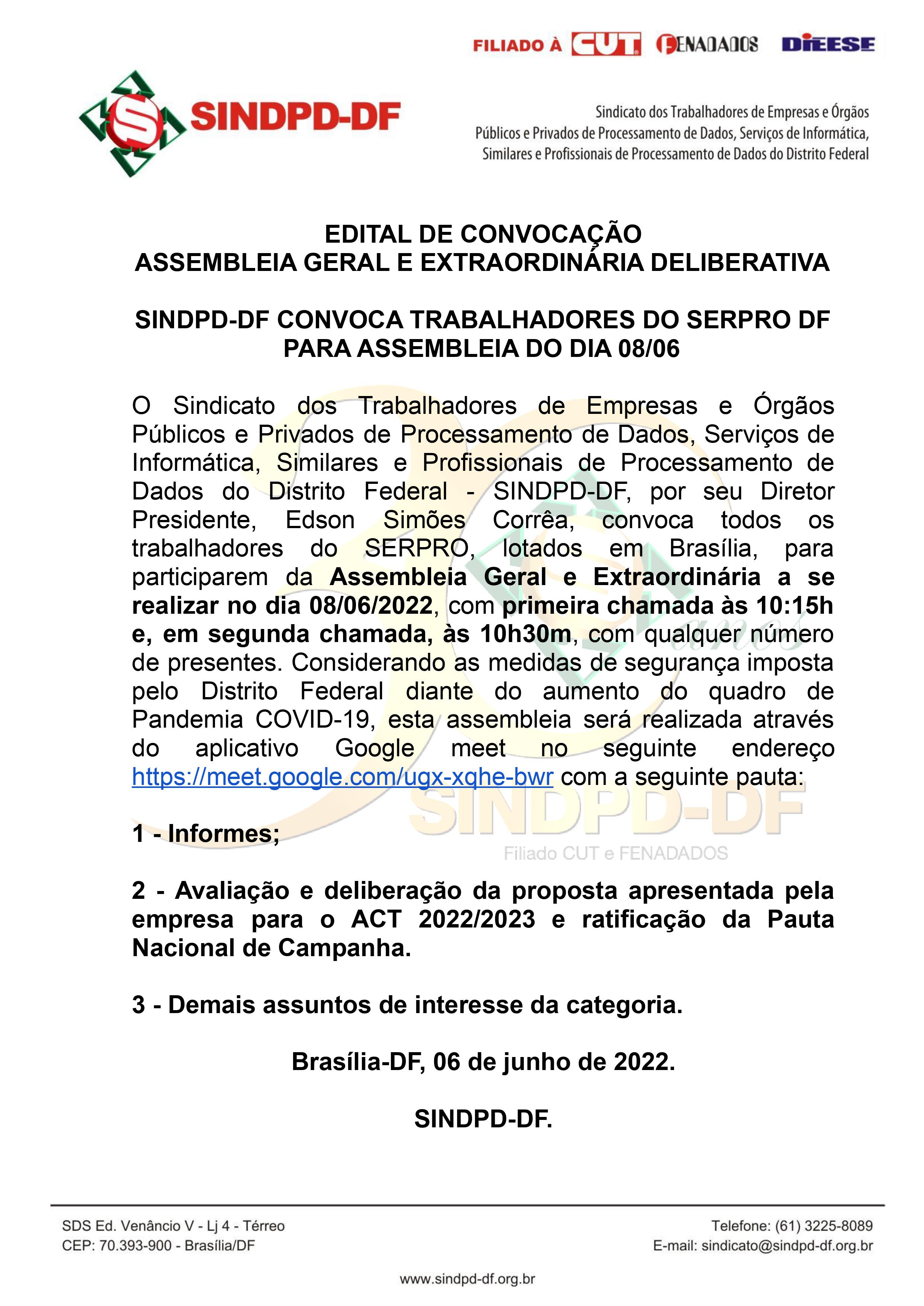 Notícias 06/06/2022 - SINDPD-DF CONVOCA TRABALHADORES DO SERPRO DF PARA ASSEMBLEIA ONLINE 14/08/2025 Link aqui: https://meet.google.com/ugx-xqhe-bwr