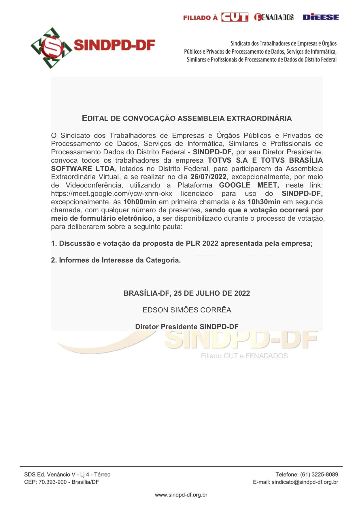 Notícias 25/07/2022 - SINDPD-DF CONVOCA TRABALHADORES DA TOTVS S.A E TOTVS BRASÍLIA SOFTWARE 14/08/2025