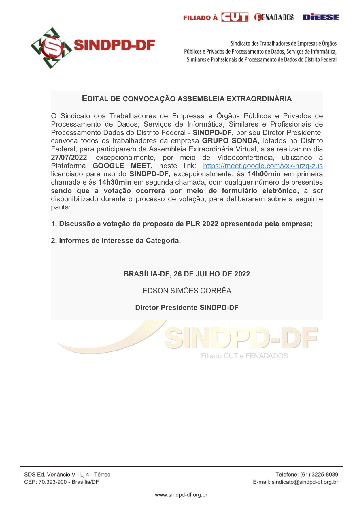 Notícias 26/07/2022 - SINDPD-DF CONVOCA TRABALHADORES DO GRUPO SONDA 14/08/2025 LINK DA ASSEMBLEIA AQUI: https://meet.google.com/vxk-hrzq-zus
